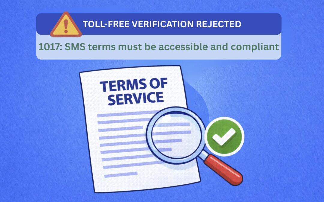 Your Toll-Free number verification was rejected because the SMS Terms and Conditions required for the messaging program are missing, incomplete, or inaccessible. Messaging from this Toll-Free number is blocked until compliant and reviewable Terms are provided and verification is approved.