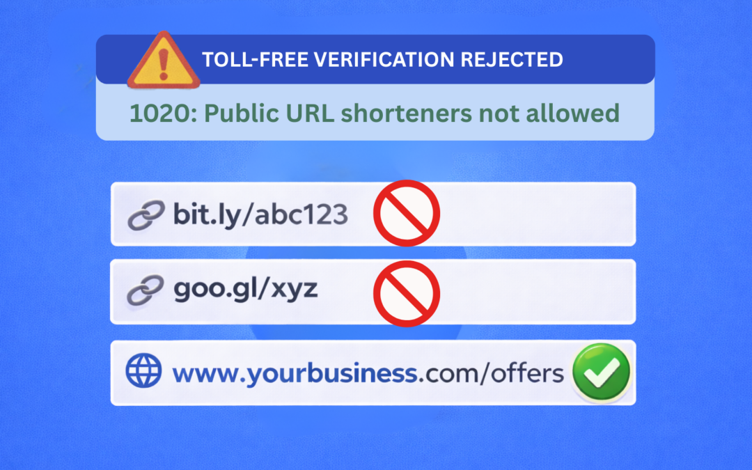Your Toll-Free number verification was rejected because the sample message content includes links from public URL shortening services. Messaging from this Toll-Free number is blocked until all URLs are updated to use branded or approved links.