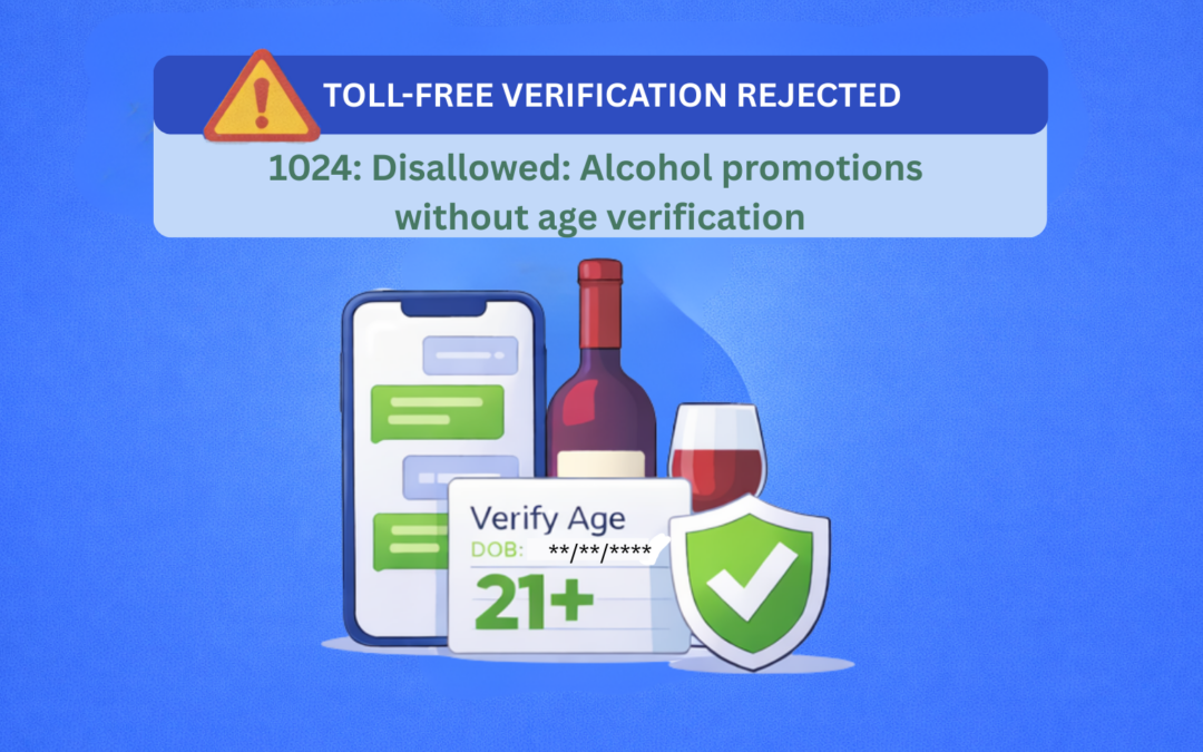 Your Toll-Free number verification was rejected because the messaging program involves alcohol-related content but does not include a compliant 21+ age verification process. Messaging from this Toll-Free number is blocked until a robust age-gating method is implemented and approved.
